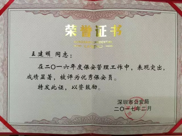 在國保安防集團保安公司獲得2016年度先進保安組織評定的同時,深圳市國保安防保安服務有限公司職員祝東波、王建明、陳文友被深圳市公安局評為“優秀保安員”,對其三人在2016年度保安管理工作中的優異表現進行了充分的肯定。