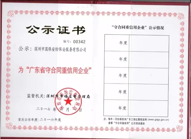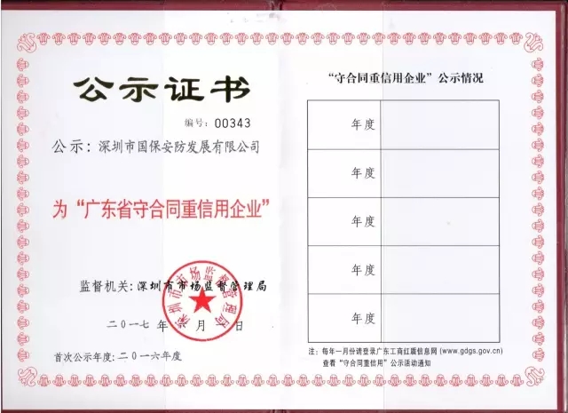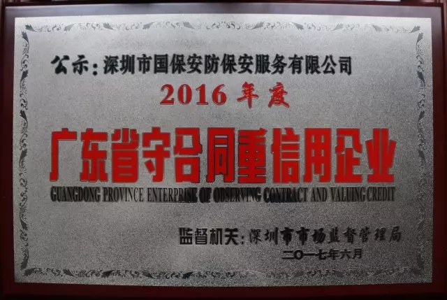 近日,在深圳市市場監督管理局開展的“守合同重信用企業”評選活動中,國保安防集團子公司“深圳市國保安防保安服務有限公司”和“深圳市國保安防發展有限公司”分別榮獲“2016年度廣東省守合同重信用企業”,這是繼“3A信用等級”、“誠信示范單位”之后,集團在誠信體系建設方面獲得的又一殊榮,集團信譽和品牌形象得到了進一步提升。