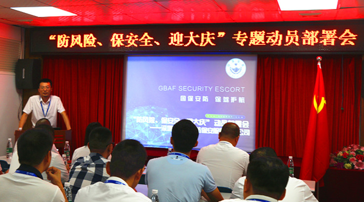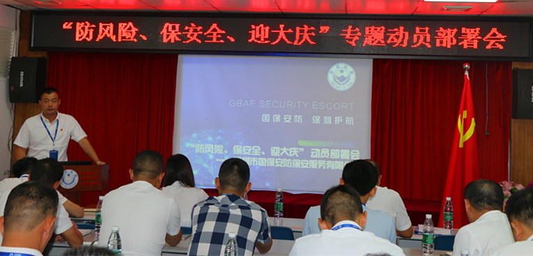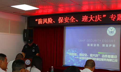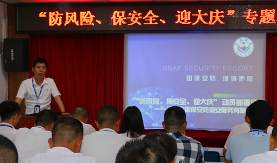 2019年9月18日下午,深圳市國保安防保安服務有限公司組織召開“防風險、保安全、迎國慶”專題動員部署會。各大隊、分公司及相關部門負責人共計35人參會,會議由張文行政總監主持。